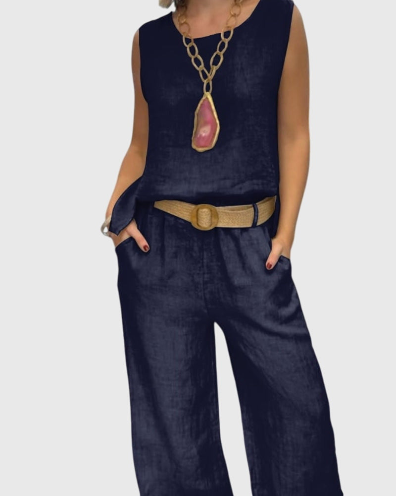 • Effortless Chic: This two-piece set combines a sleeveless top and wide-leg trousers for an effortlessly stylish look.